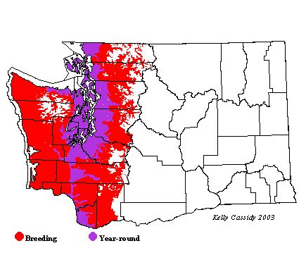 Band-tailed Pigeons are commonly found year round in western Washington lowlands, city parks, and residential areas with large conifers. They are also found in old growth in the mountains of western Washington or where forests have been opened. On the Olympic Peninsula, they can be found in small clearcuts with nearby forest patches. In the southern Cascades, they occur up to the Cascade Crest and, very rarely, over the crest in streamside forests on the eastern slopes. In winter, birds are often sustained by food provided by humans. Those that migrate start returning in late February.