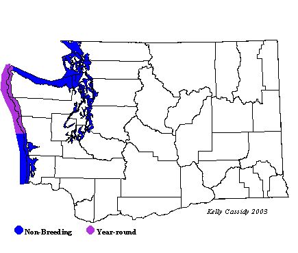 Common Murres nest at 18 locations along the outer Washington coastline, with as many as 10,000 birds to a colony. They arrive on the colonies in April and may be found there until September. Major colonies are located at Point Grenville, Split Rock, Willoughby Island, Quillayute Needles, and Carroll and Jagged Islands. They can be seen in these areas year round, and in deep-water, inland-marine habitats as well in the fall and winter. They are fairly common on inland waters at other times of the year.