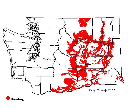 During the breeding season, Lark Sparrows are fairly common but local in eastern Washington below the lower treeline in the central Columbia Basin, and in agricultural areas in northeastern Washington at the edge of the Ponderosa pine zone. In Okanogan County, they can be found in the grassland and sagebrush in Brewster, and at Bridgeport State Park. In Douglas County, they can be found breeding at Jameson Lake. Sun Lakes State Park and Potholes Lakes are spots in Grant County where Lark Sparrows breed. In eastern Yakima County, they are common around ranch pastures and open shrub-steppe in eastern Moxee Valley, north of Sunnyside, and along the easterly margin of the Yakima Training Center, north along the Columbia through Kittitas and Chelan Counties to Wenatchee.